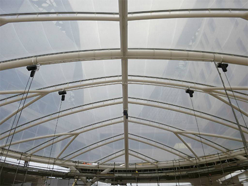 ETFE膜使用寿命至少为25-35年,是用于永久性多层可移动屋顶结构的理想材料。该膜材料多用于跨距为4米的两层或三层充气支撑结构,也可根据特殊工程的几何和气候条件,增大膜跨距。膜长度以易安装为标准,一般为15-30米。小跨度的单层结构也可用较小规格。